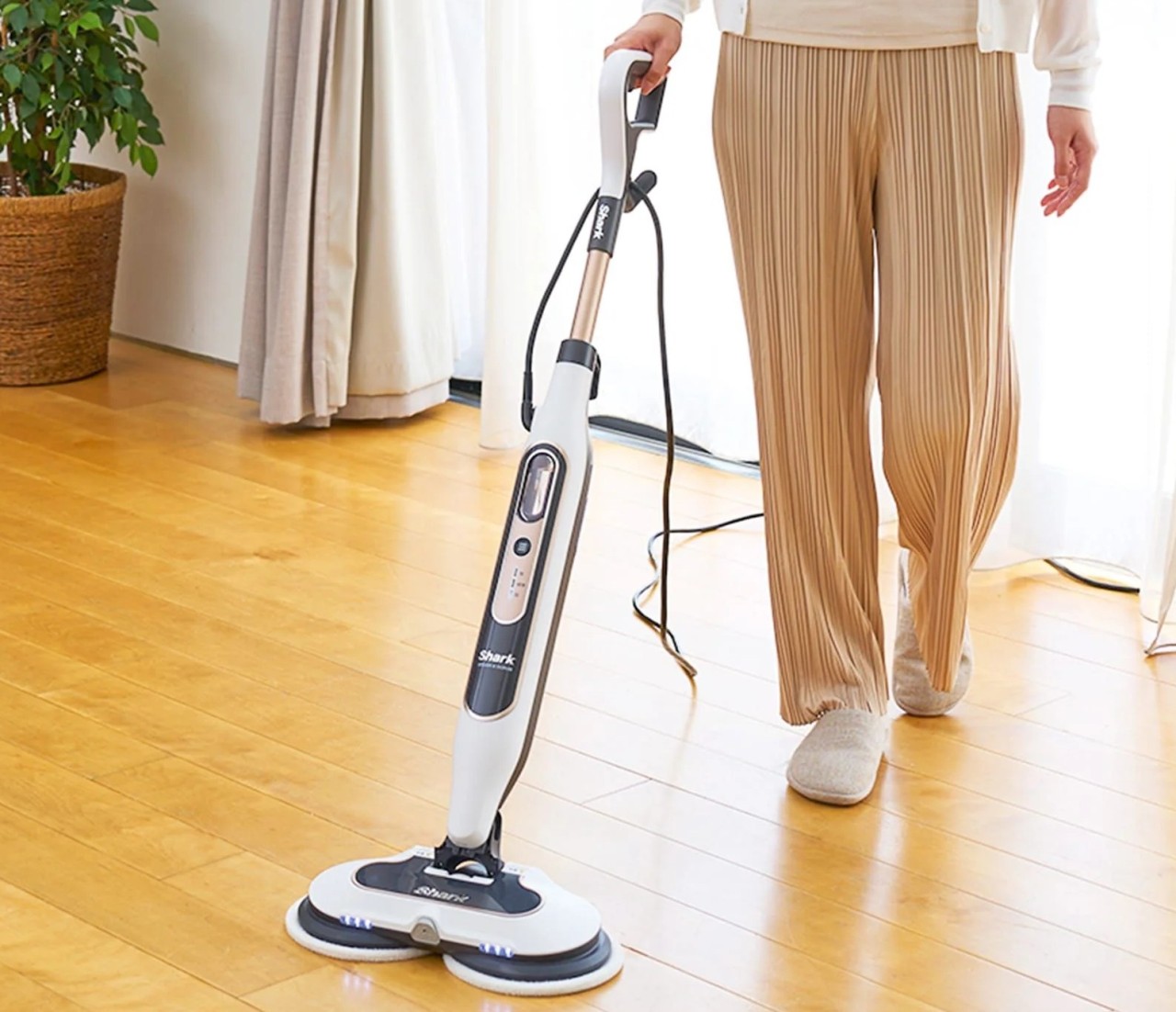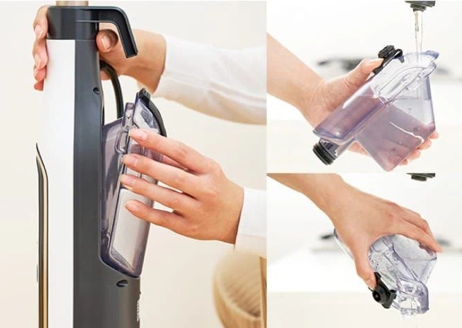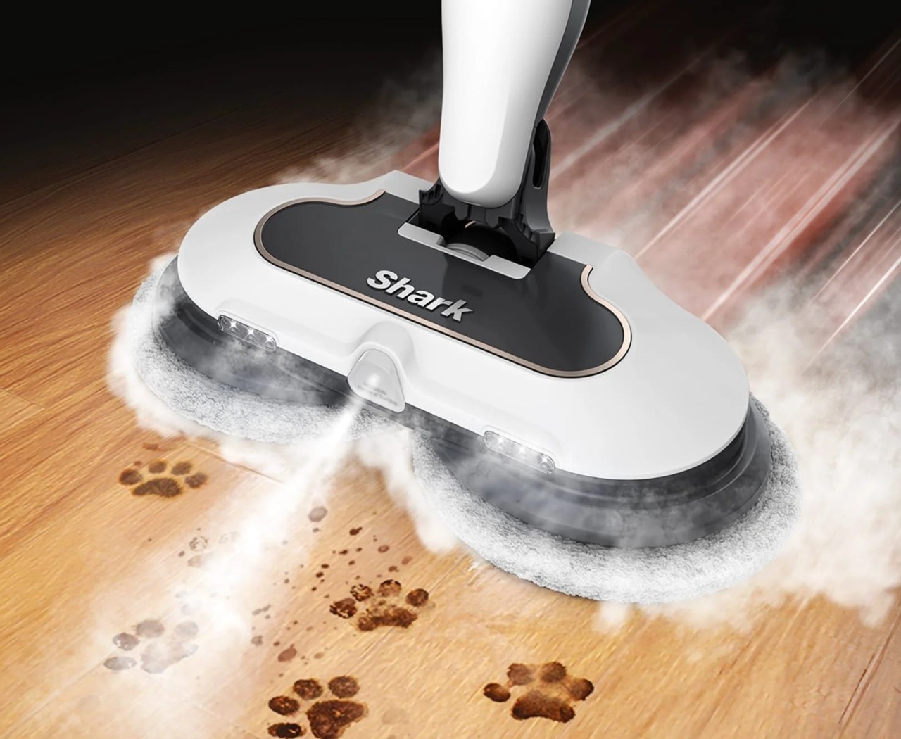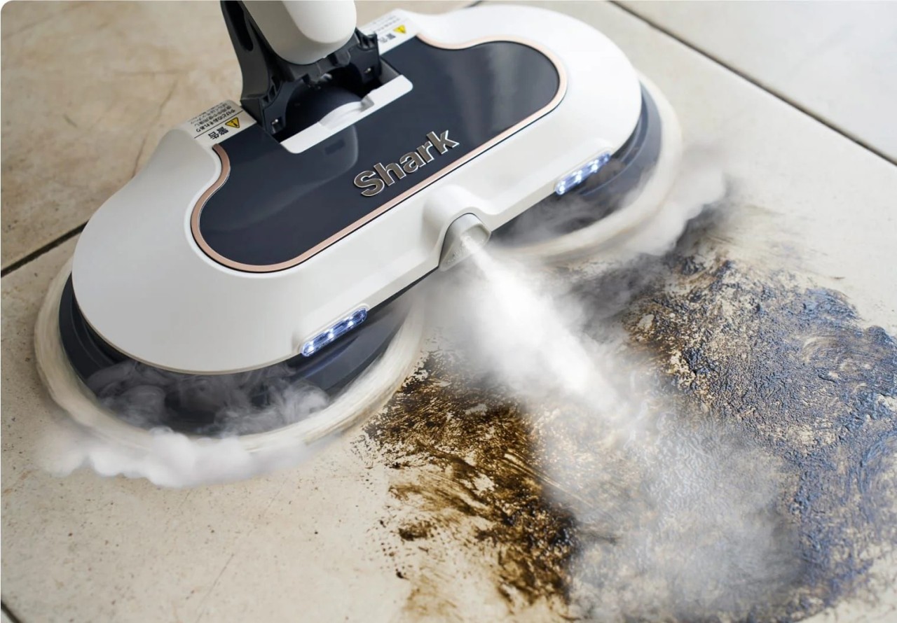 頑固な汚れを高温スチームの集中噴射と高速回転パッドで徹底的に除去する回転スチームモップ 20秒の急速立ち上げでサッときれいにできる