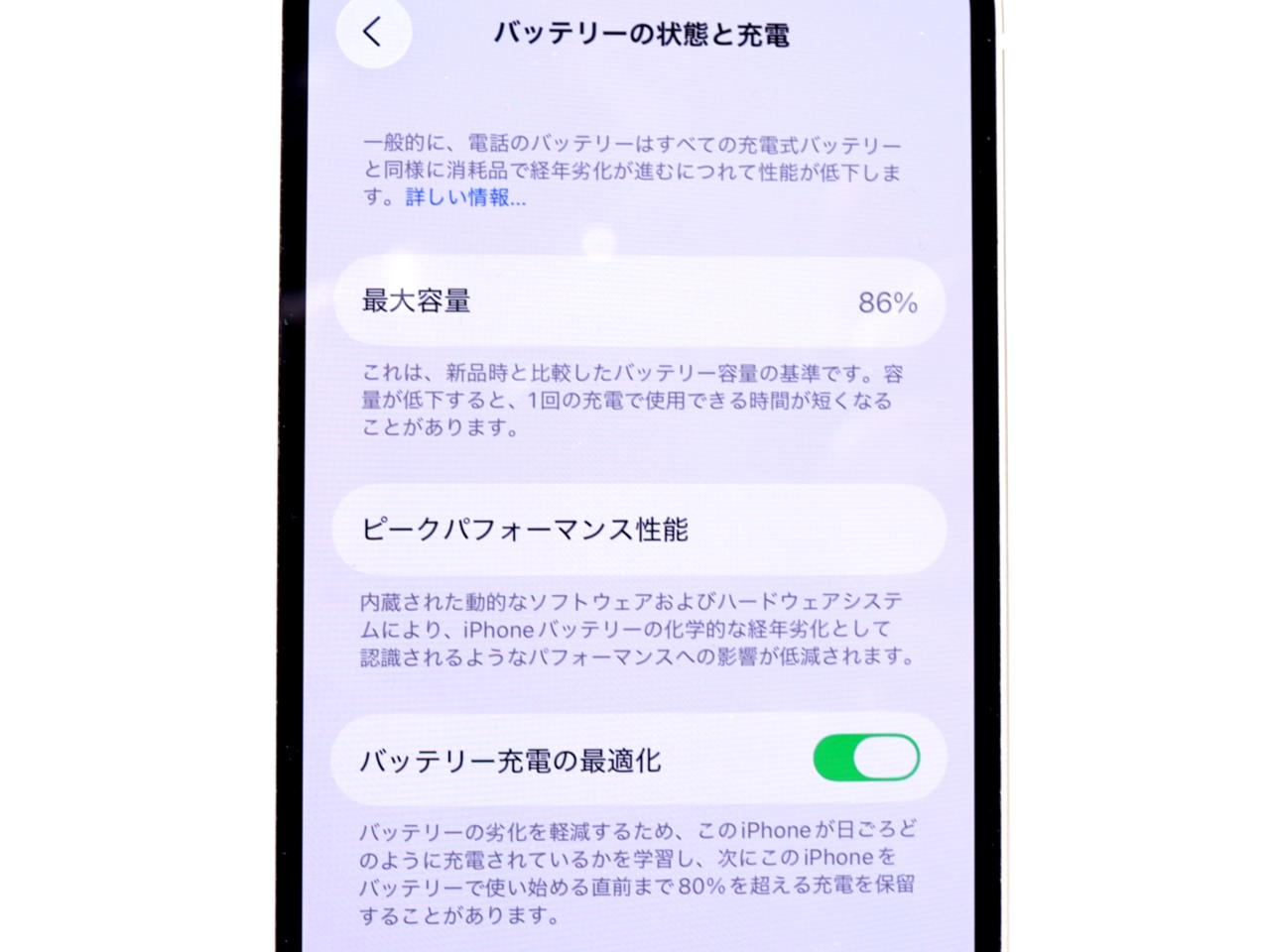 バッテリー最大容量表示=86%です。