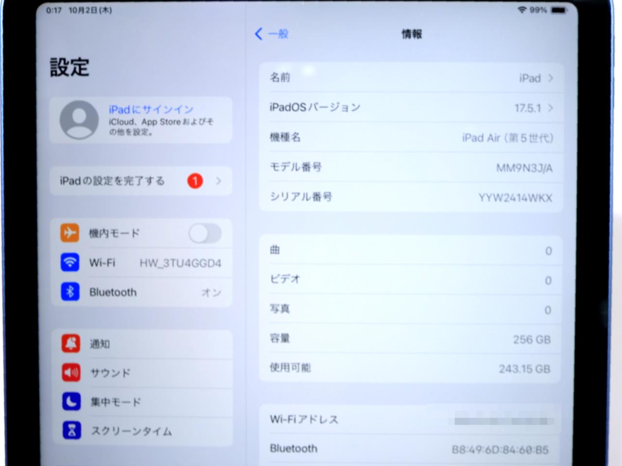 APPLE [USED]u058902 iPad Air 10.9インチ 第5世代 Wi-Fi 256GB 2022年春モデル MM9N3J/A [ブルー] の 商品仕様: