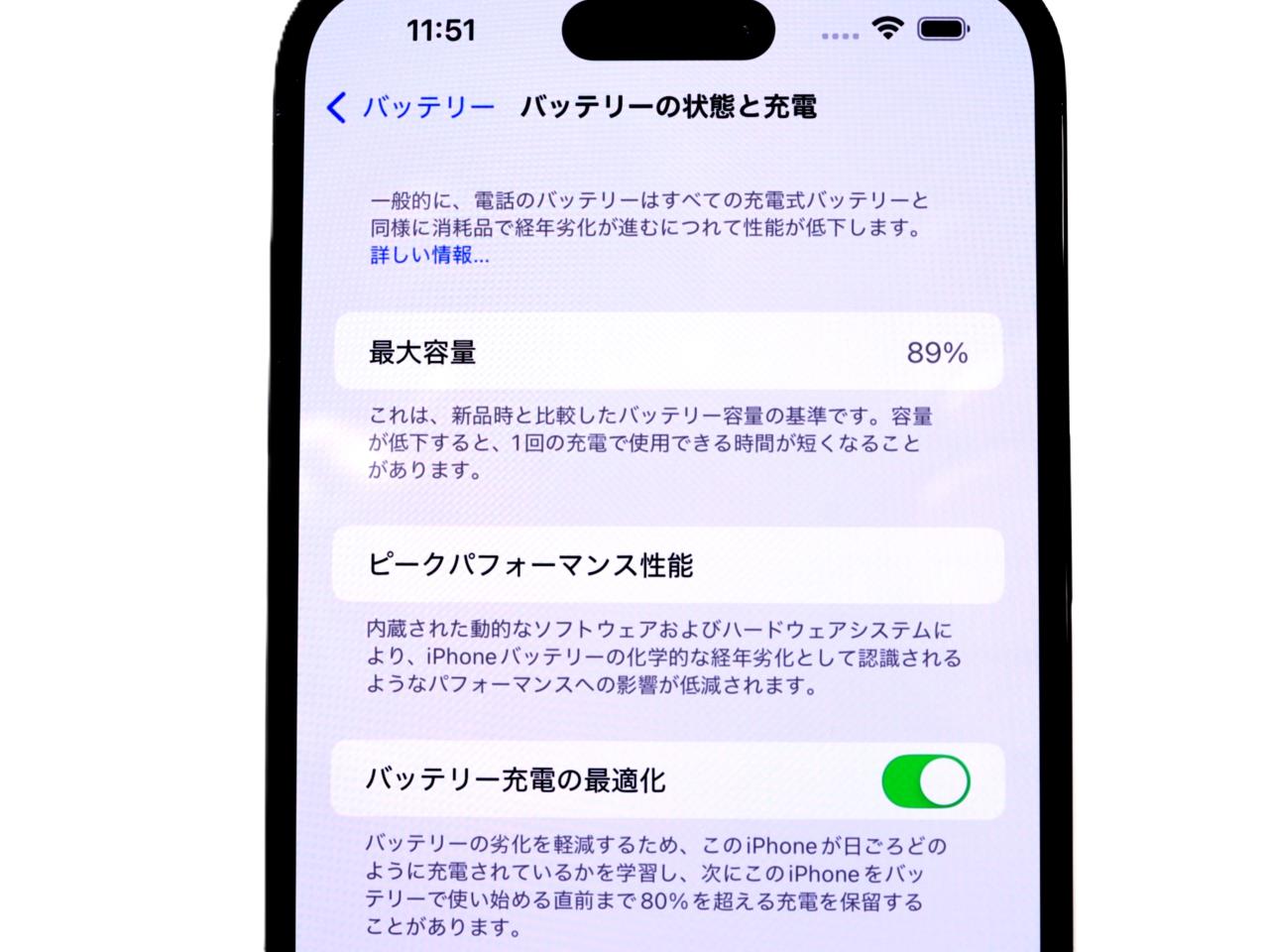 バッテリー最大容量表示=89%です。