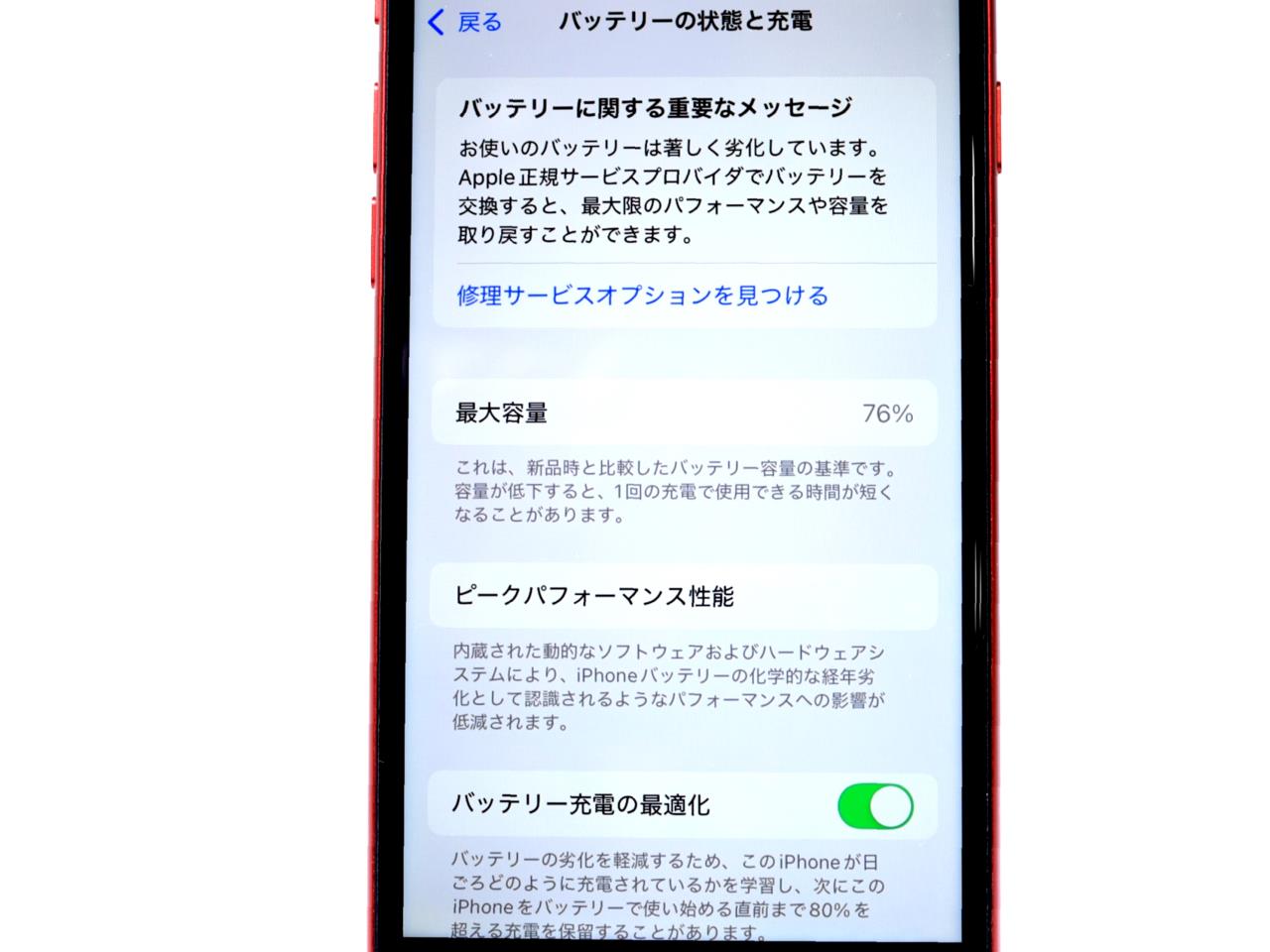 バッテリー最大容量=76%です。