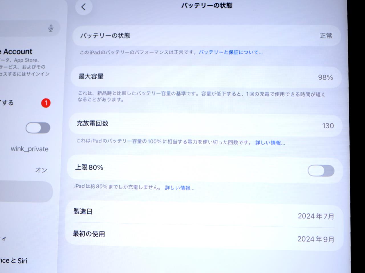 バッテリー最大容量=98%です。 充放電回数=130
