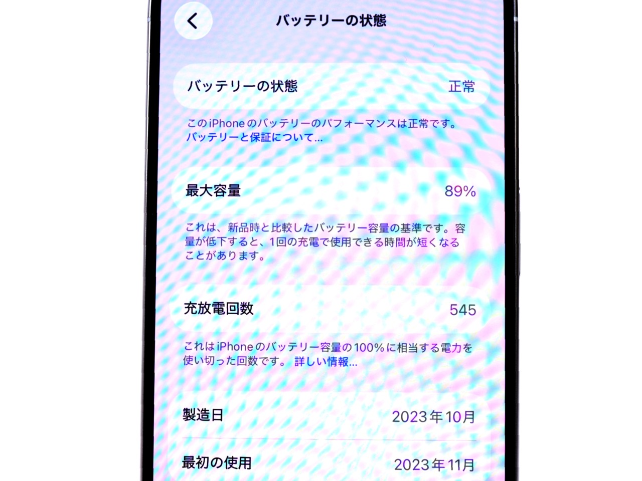 バッテリー最大容量表示=89%です。