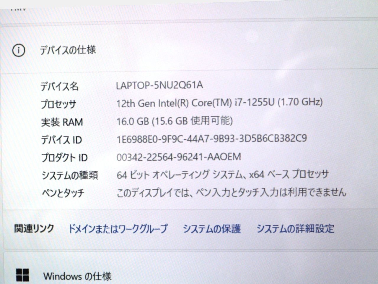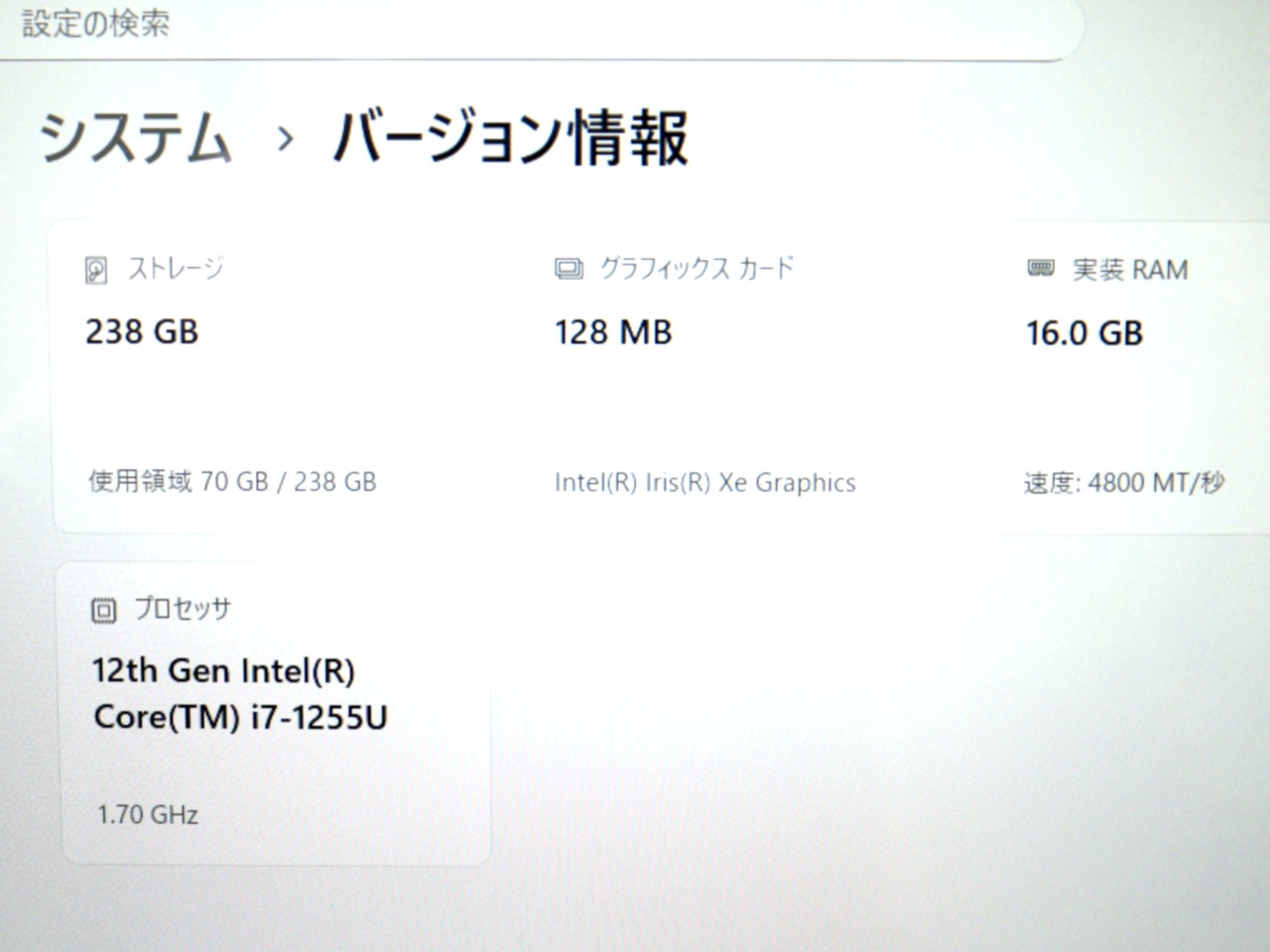 CPU : 第12世代 インテル Core i7 1255U(Alder Lake) 10コア