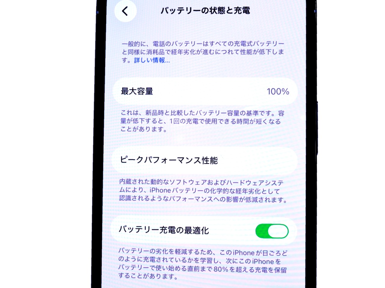 バッテリー最大容量表示=100%です。