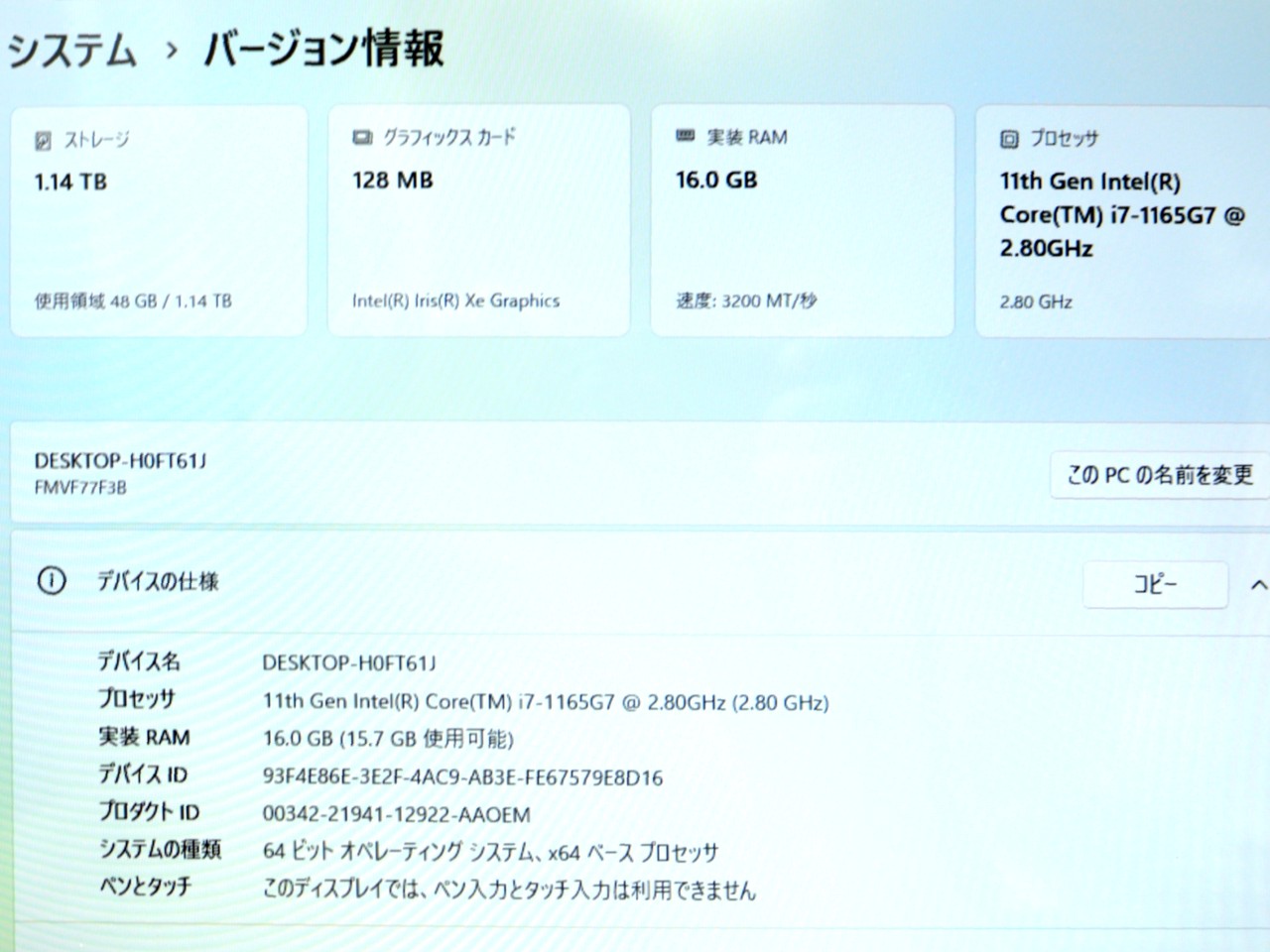 CPU種類:第11世代 インテル Core i7 1165G7(Tiger Lake)