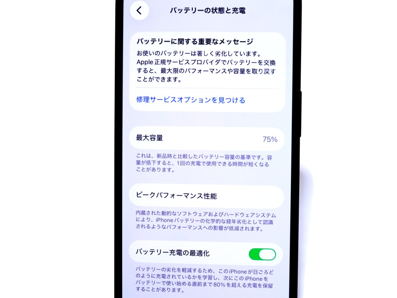バッテリー最大容量=75%です。修理推奨表示がでております。