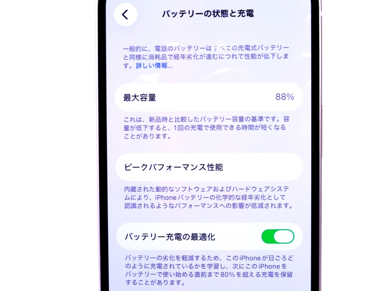 バッテリー最大容量=88%です。