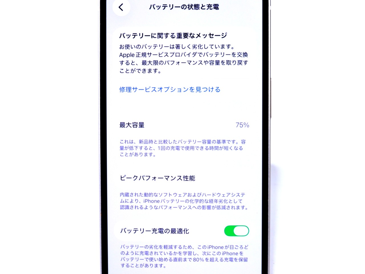 バッテリー最大容量=75%です。バッテリー交換推奨表示が出ています。