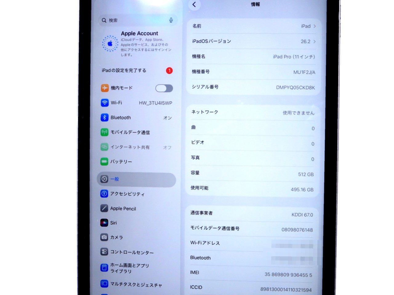APPLE [USED]u059966 iPad Pro 11インチ Wi-Fi+Cellular 512GB MU1F2J/A SIMフリー [スペースグレイ] の 商品仕様: