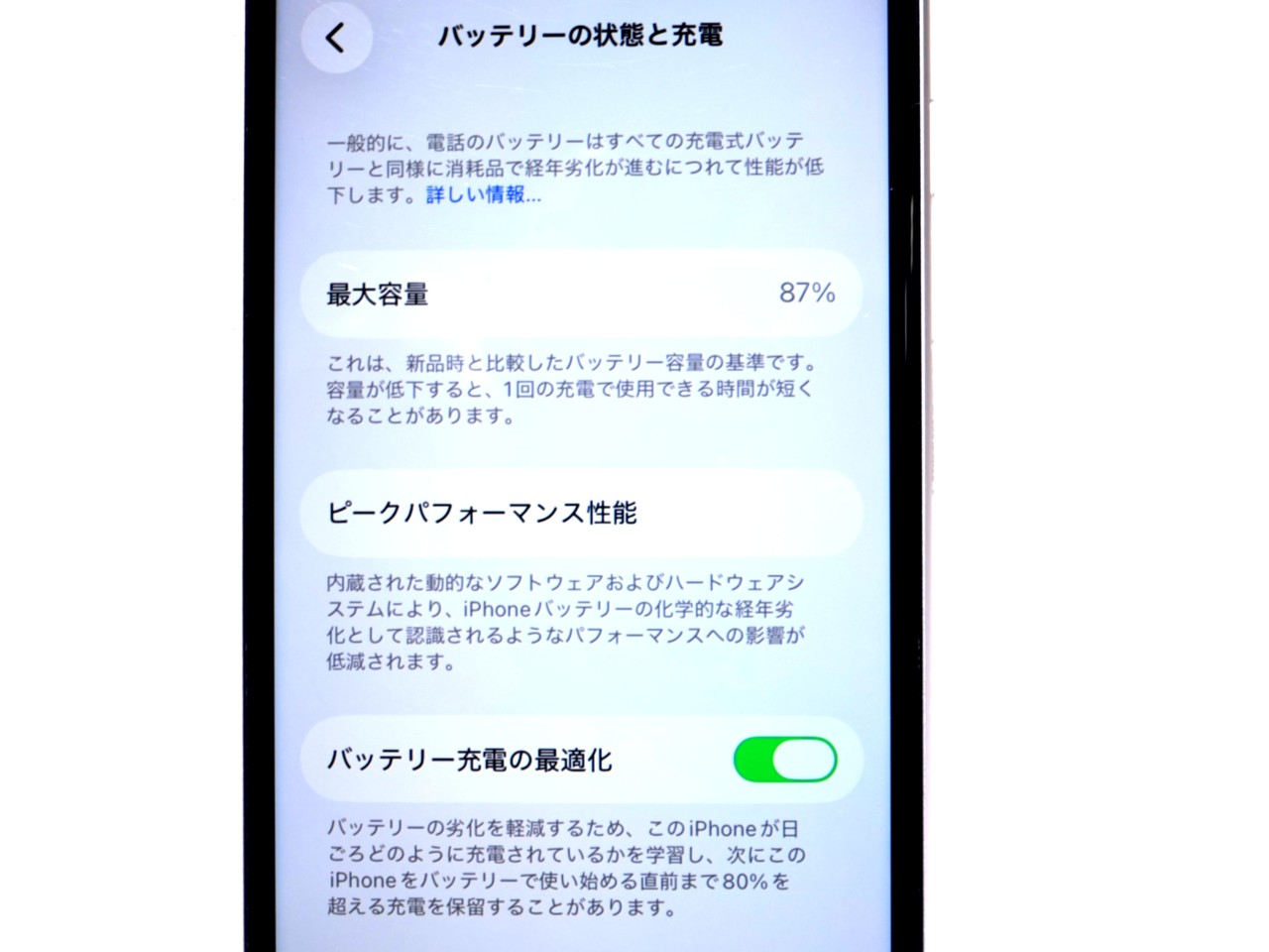 バッテリー最大容量=87%です。