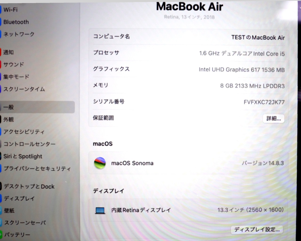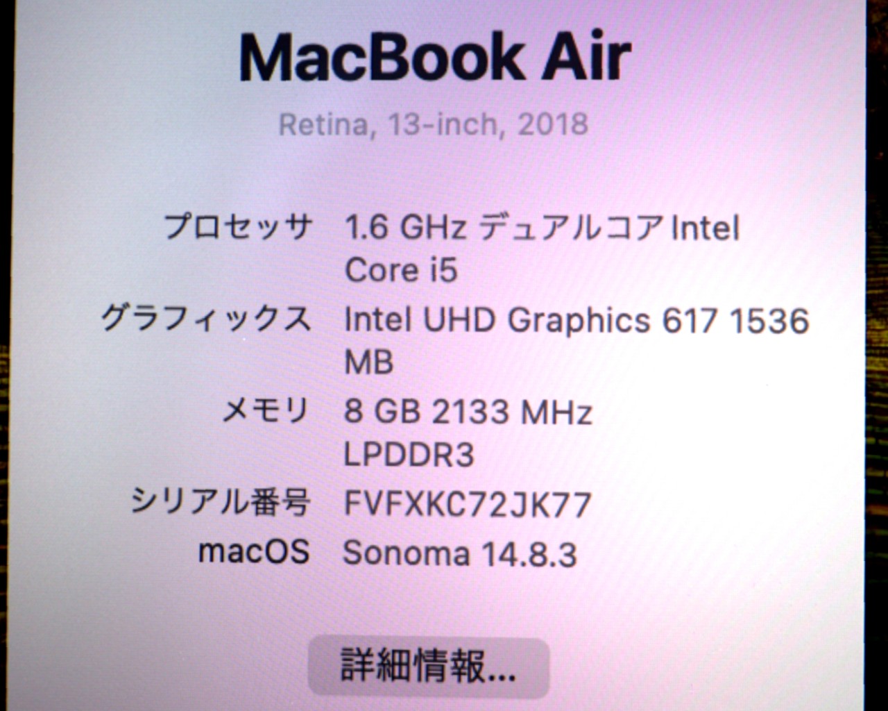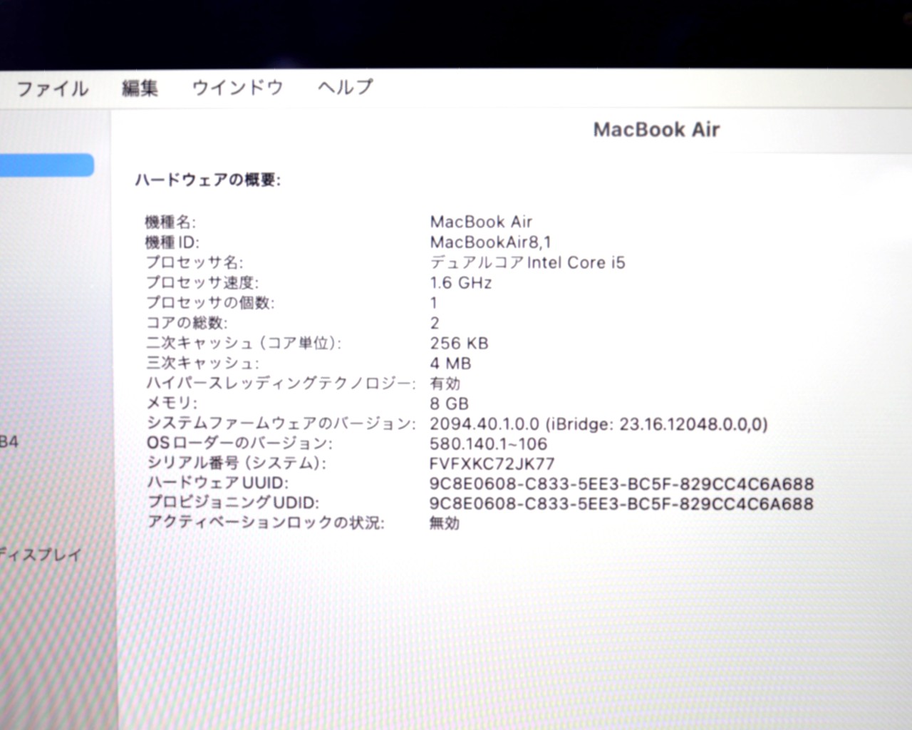 CPU : Core i5、1.6GHz/2コア