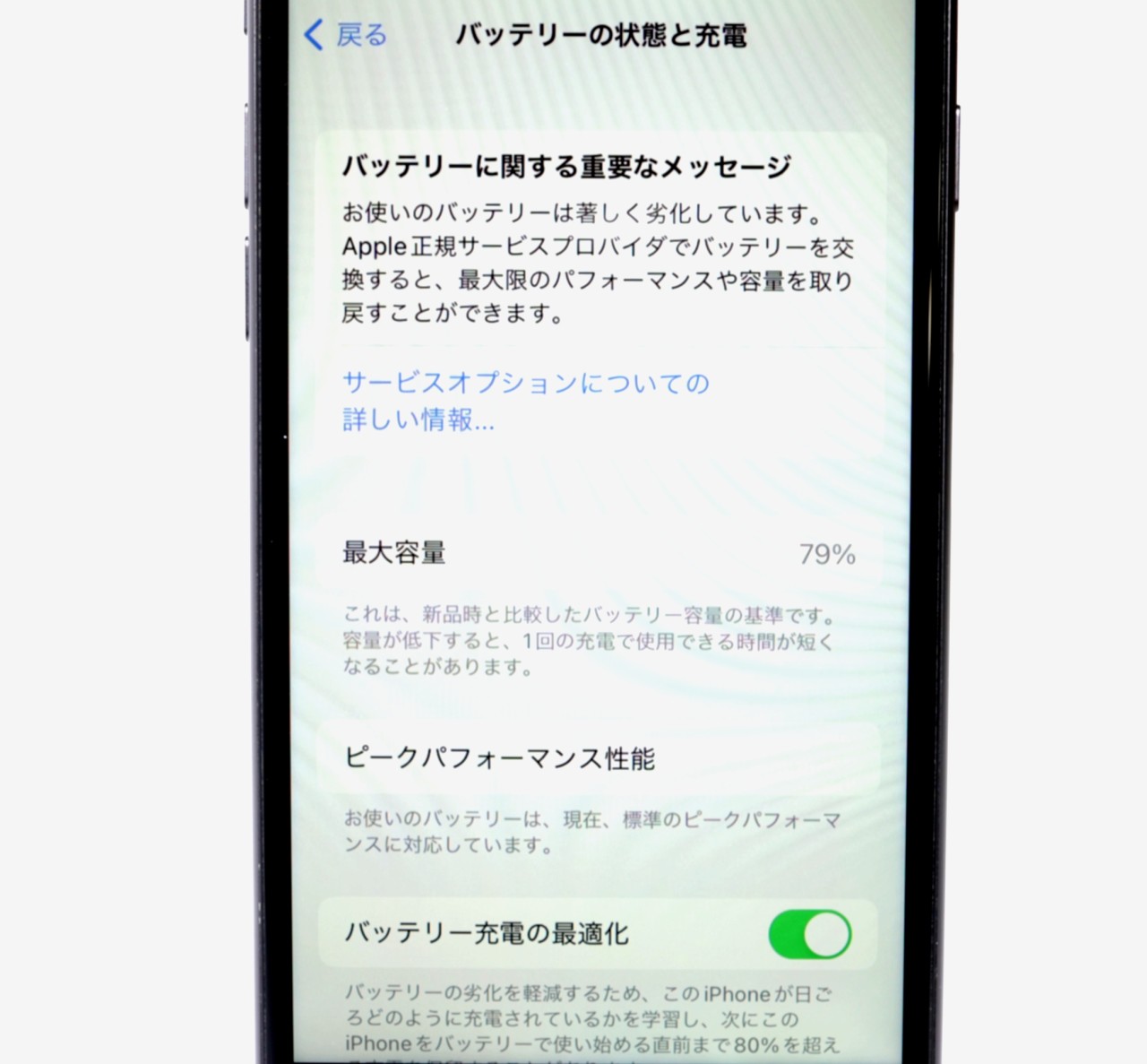 バッテリー最大容量=79%です。修理推奨表示が出ております。