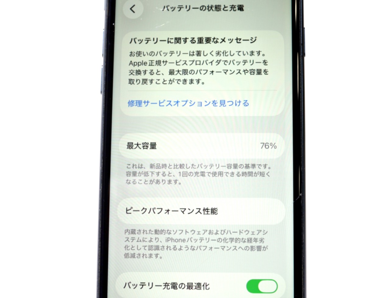バッテリー最大容量=76% バッテリー劣化が進んでおります。