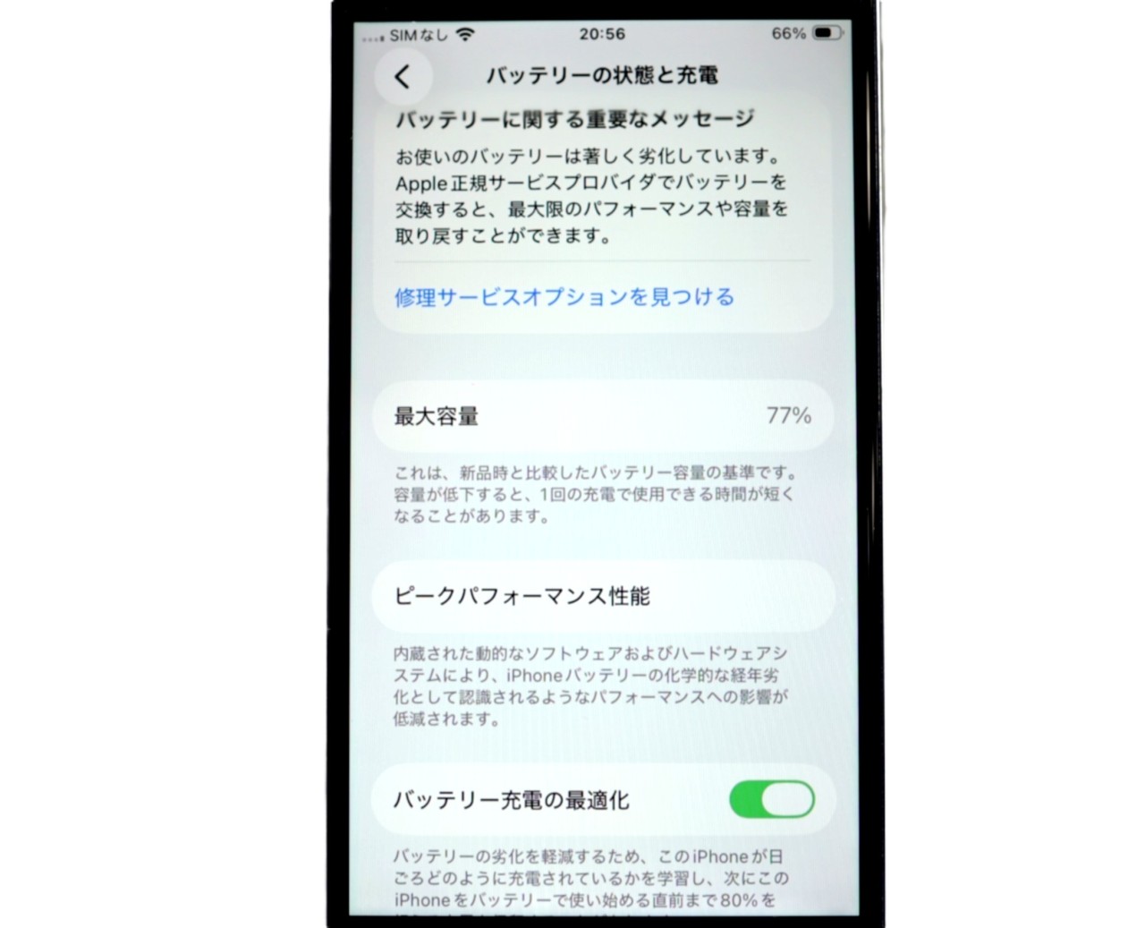 バッテリー最大容量=77%です。バッテリー劣化が進んでおります。