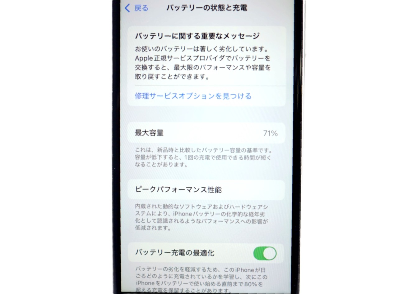 バッテリー最大容量=71% バッテリー劣化が進んでおります。