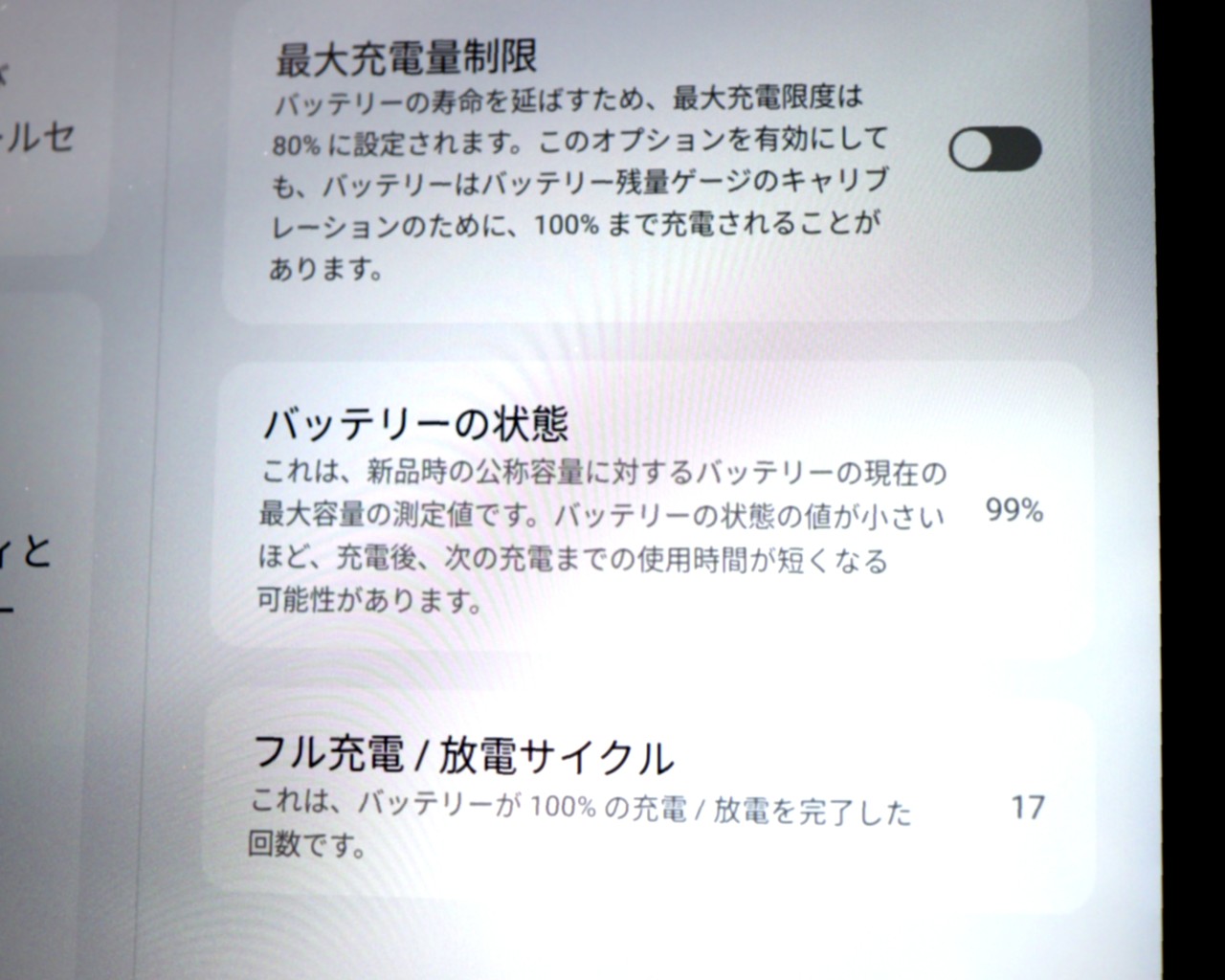 バッテリー最大容量=99%です。