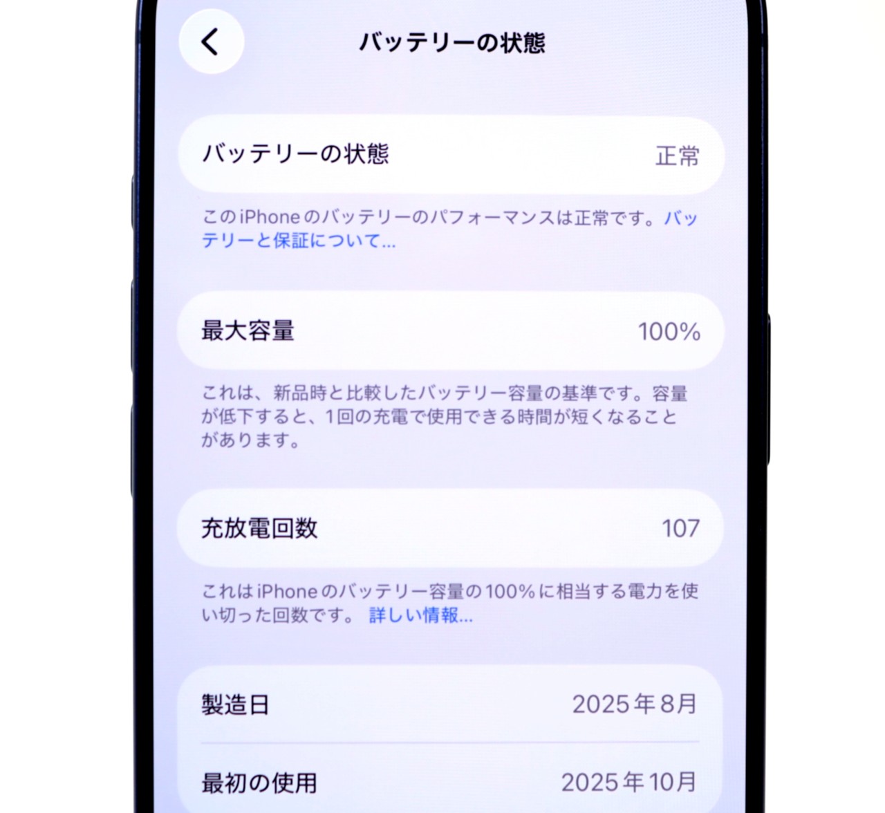 バッテリー最大容量=100%です。充放電回数=107回