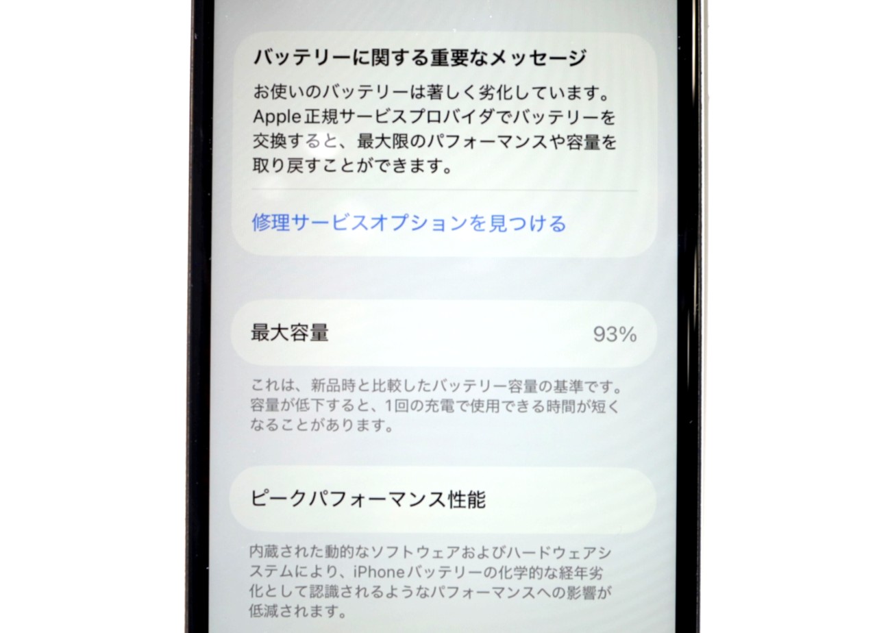 バッテリー最大容量=93% バッテリーが劣化していると表示されます。
