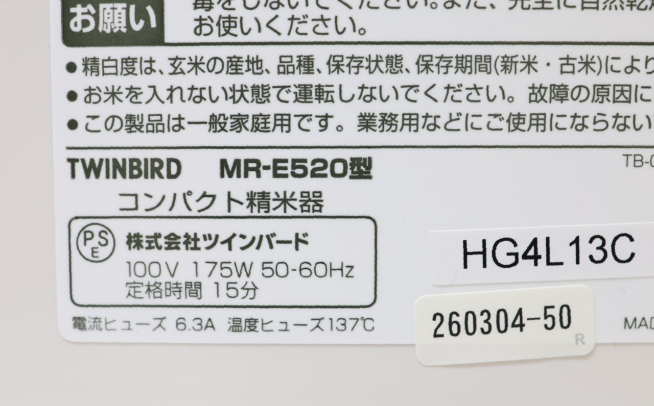 TWINBIRD [中古]精米機 精米御膳 MR-E520W
