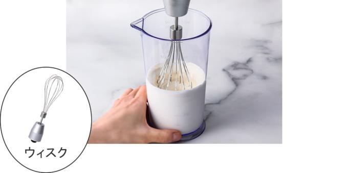 アタッチメントを替えるだけで 「つぶす」「混ぜる」「泡立てる」「かき混ぜる」が全部できる!