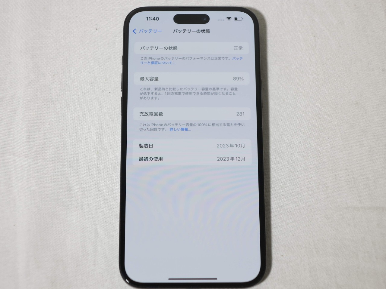 バッテリー最大容量表示=89%です。