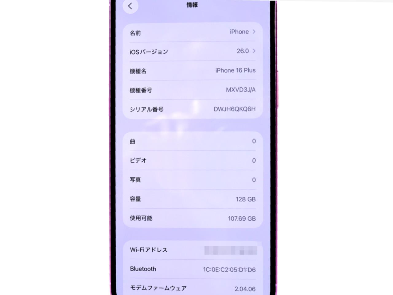 APPLE [USED]u058780 iPhone16 Plus 128GB SIMフリー [ピンク] の 商品仕様: