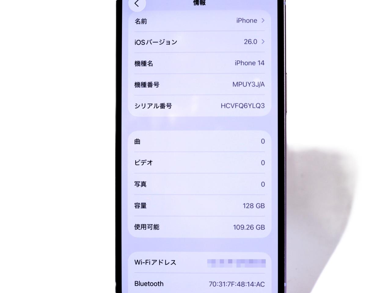 - [USED]u058888 iPhone14 128GB SIMフリー [パープル]