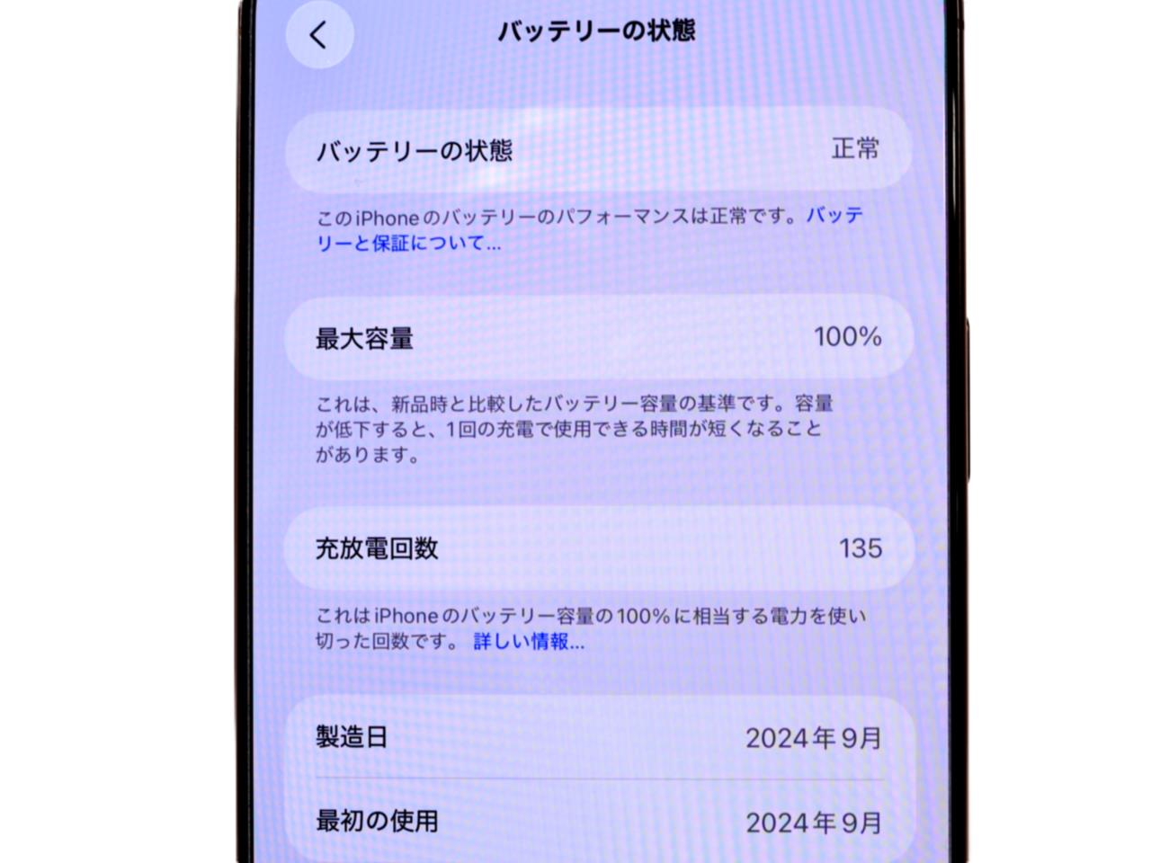 バッテリー最大容量=100%です。 IMEIチェック=各キャリア【-】