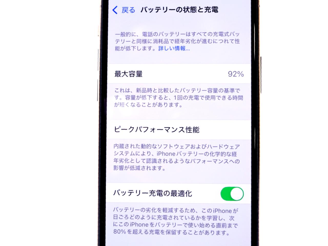 バッテリー最大容量表示=92%です。