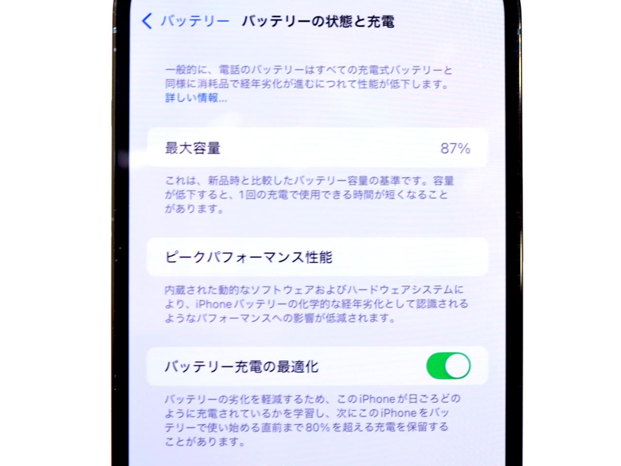 バッテリー最大容量表示=87%です。