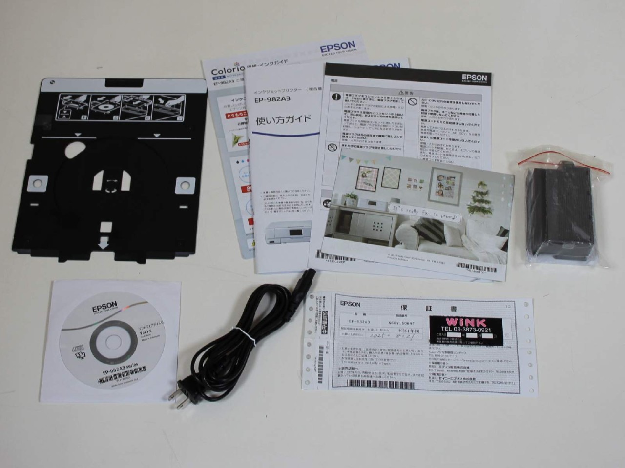 付属品 : セットアップ用インクカートリッジ(ブラック、シアン、マゼンタ、イエロー、ライトシアン、ライトマゼンタ)/ソフトウェアディスク(ユーザーズガイド、ドライバー等)/使い方ガイド他(紙)/ディスクトレイ/電源コード/