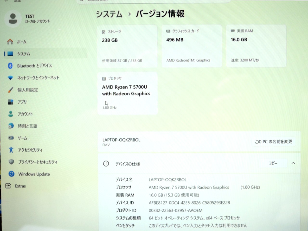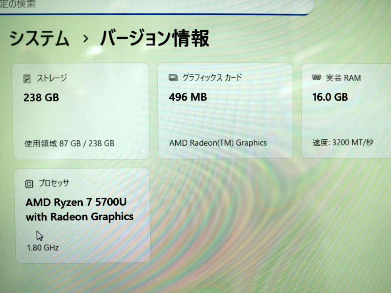 CPU : AMD Ryzen 7 5700U 1.8GHz/8コア