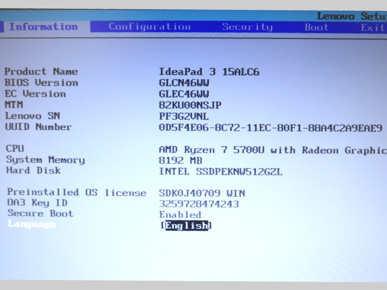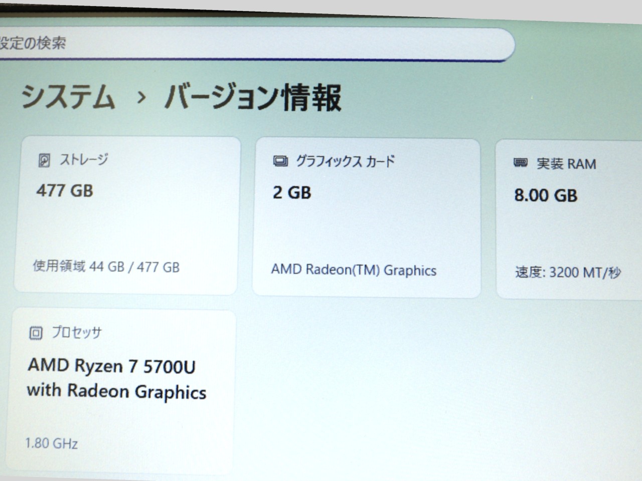 CPU:AMD Ryzen 7 5700U/1.8GHz/8コア