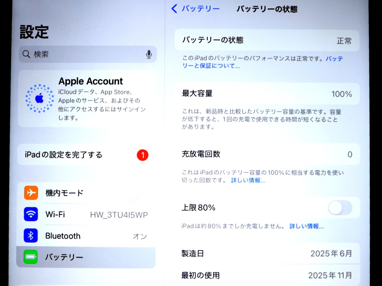バッテリー最大容量=100%です。 充放電回数=0回
