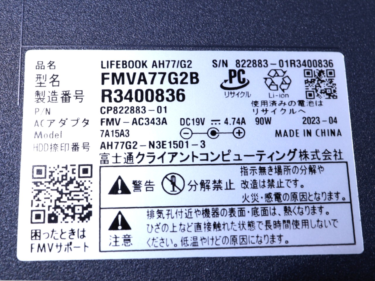 FUJITSU [中古]WindowsノートPC FMV LIFEBOOK AH77/G2 FMVA77G2B