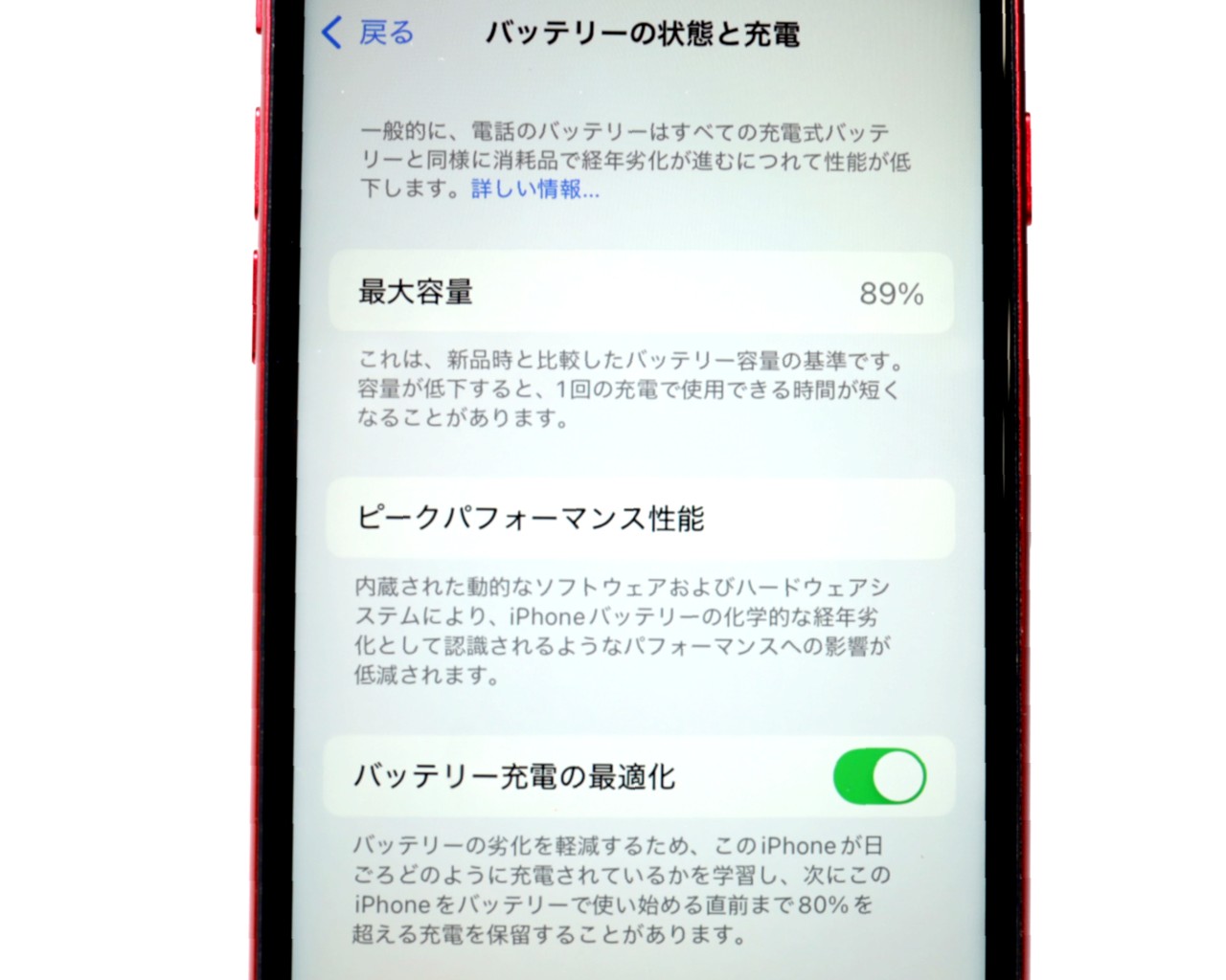 バッテリー最大容量=89%です。