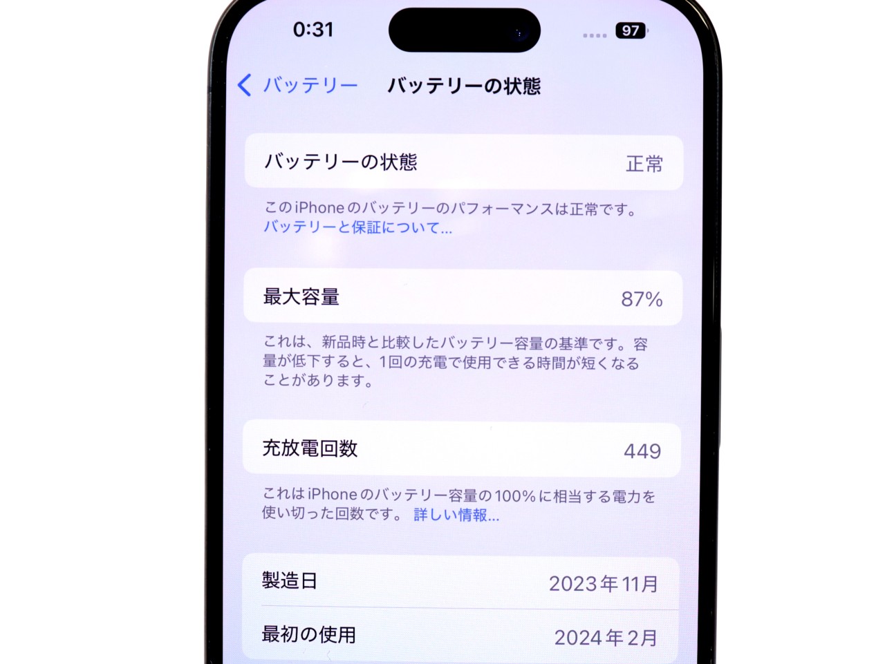 バッテリー最大容量=87%です。