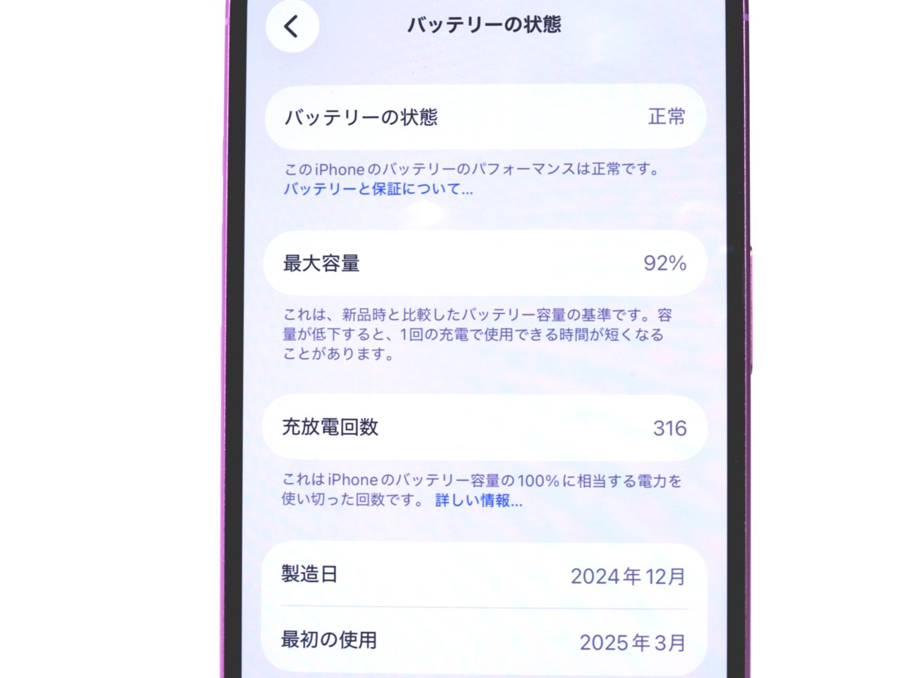 バッテリー最大容量=92%です。