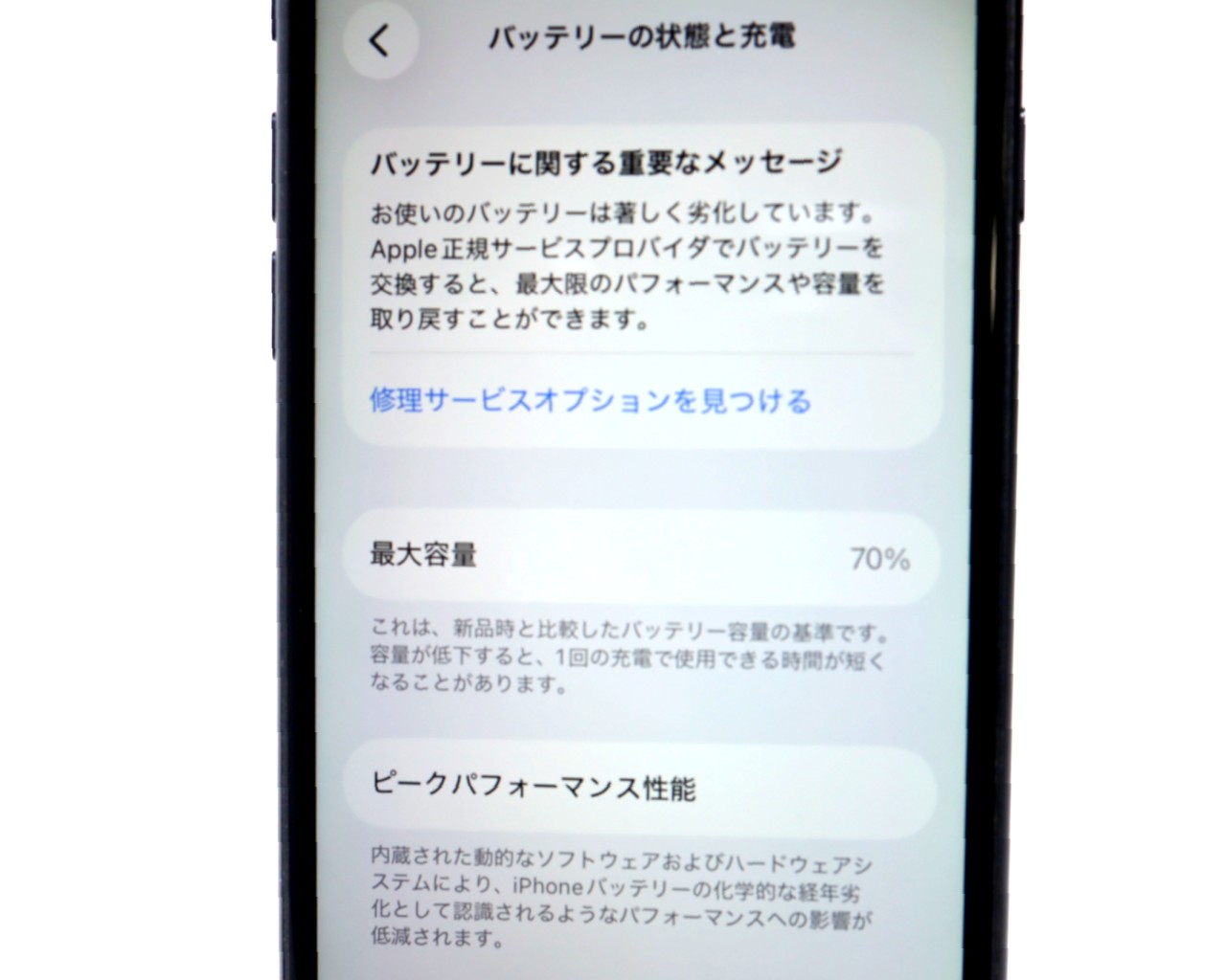 バッテリー最大容量=70%です。バッテリー劣化が進んでおります。