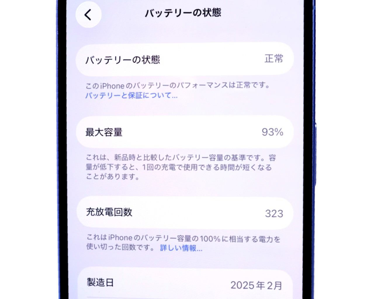 バッテリー最大容量=93%です。