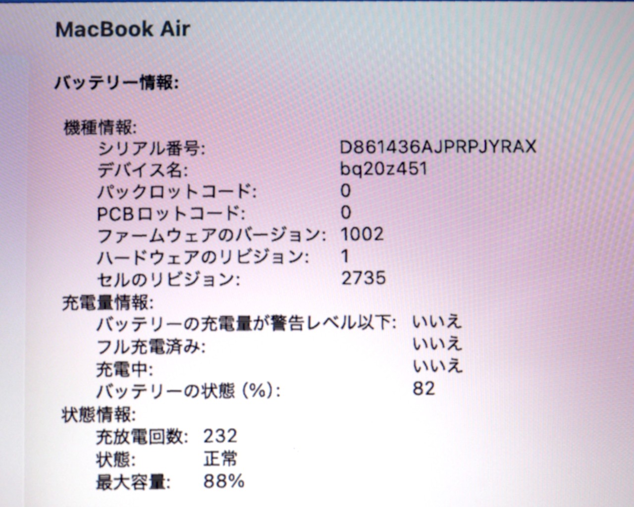 バッテリー最大容量=88% 充放電回数=232回