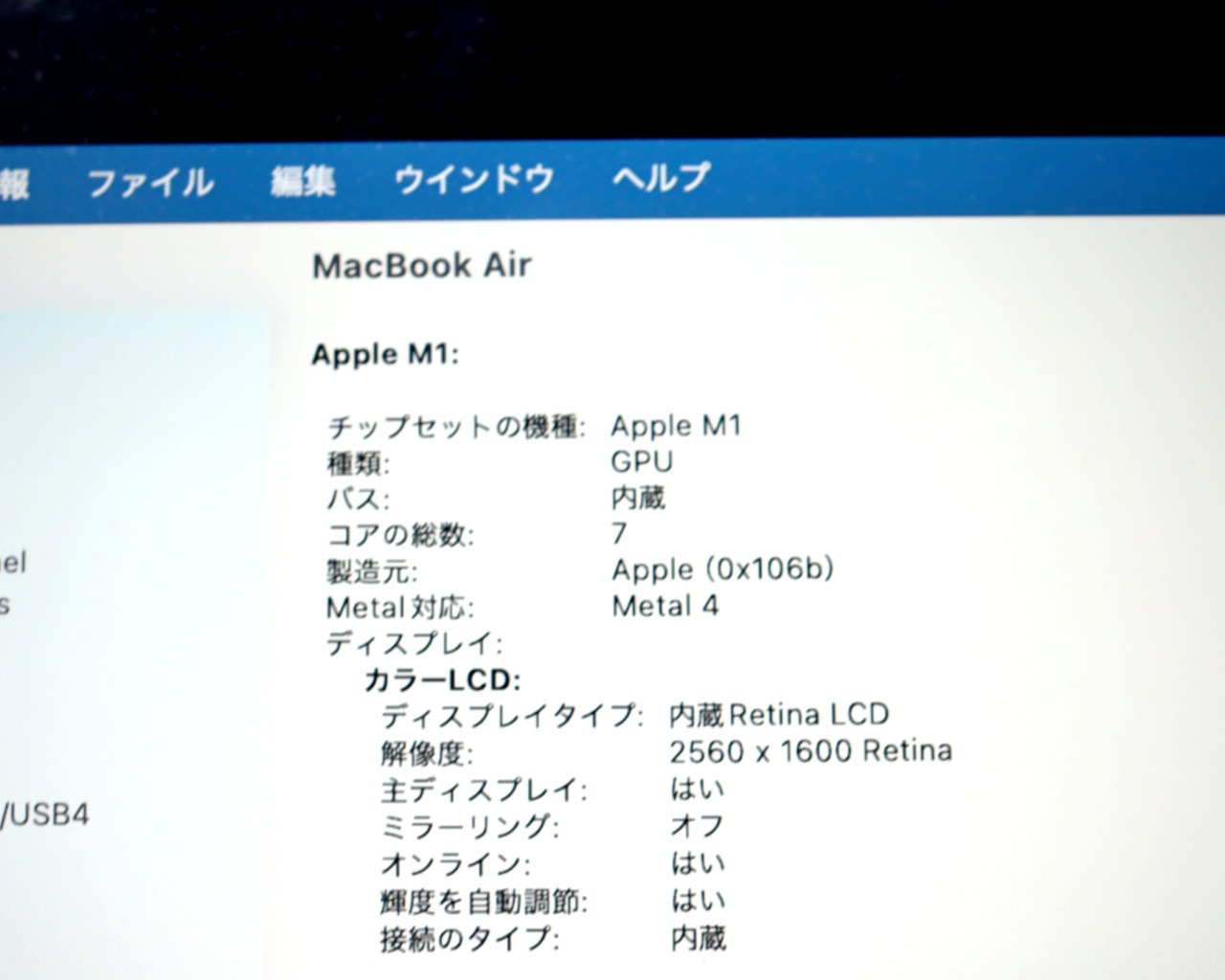 ビデオチップ : Apple M1チップ 7コアGPU 16コアNeural Engine