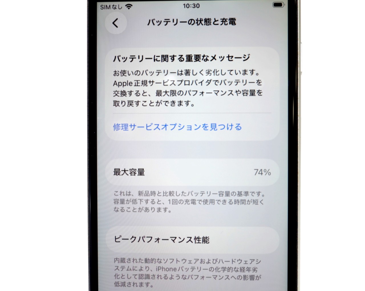 バッテリー最大容量=74%です。バッテリー劣化が進んでおります。