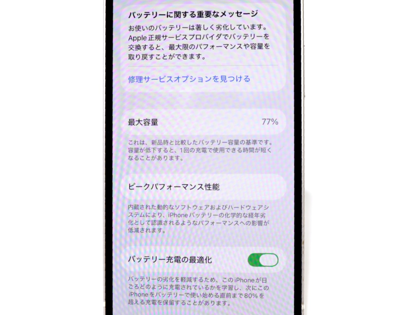 バッテリー最大容量=77%です。バッテリー劣化が進んでおります。