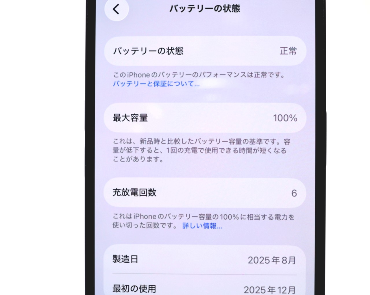 バッテリー最大容量=100%です。 充放電回数=0回