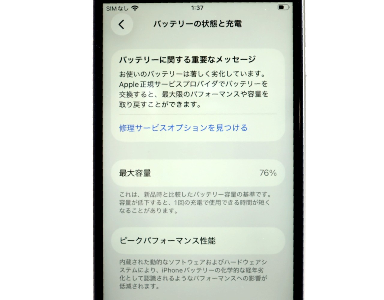 バッテリー最大容量=76%です。バッテリー劣化が進んでおります。