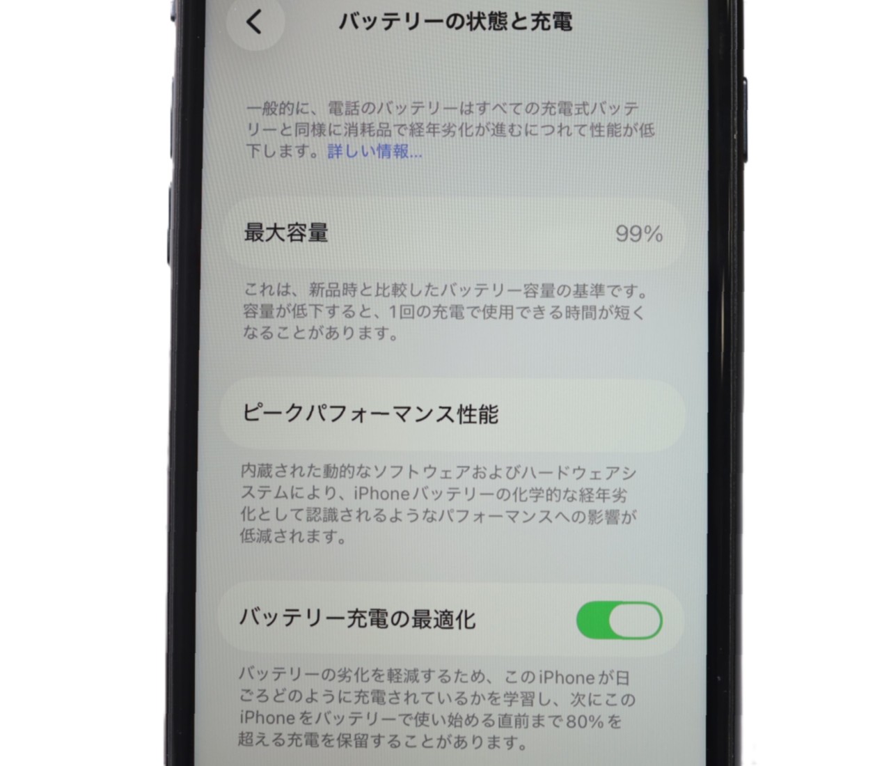 バッテリー最大容量=99%