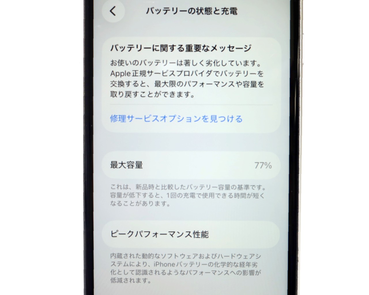 バッテリー最大容量=77% バッテリー劣化が進んでおります。
