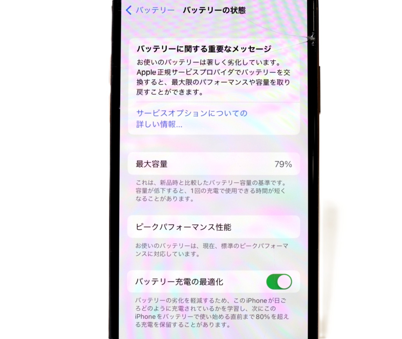バッテリー最大容量=79% 修理推奨表示あり。